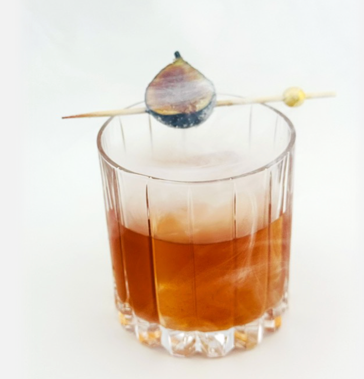 In a mixing glass add Re’al Fig Purée, and orange bitters. Stir with ice and strain over a large ice cube. Smoke with a vape gun filled with cinnamon smoke and garnish with a caramelized fig.